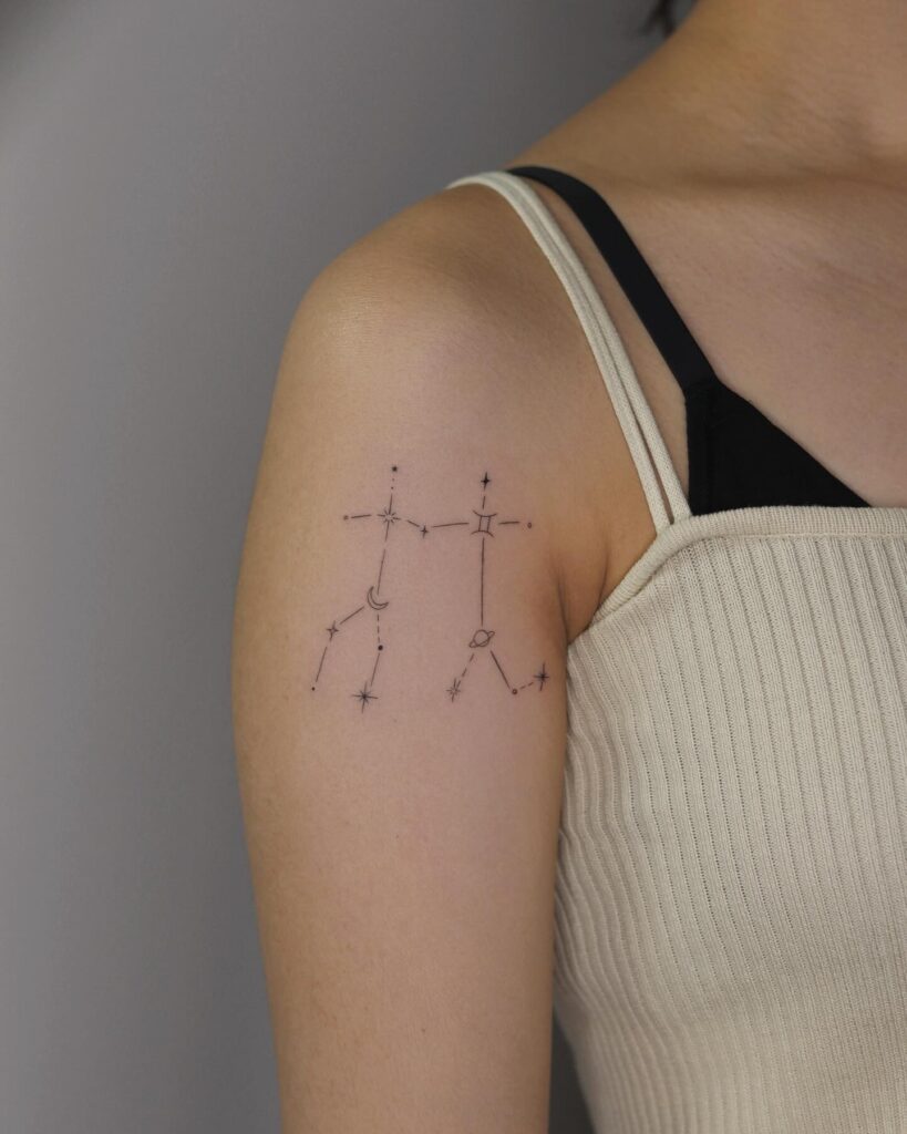 Un tatuaje de Géminis representa la dualidad, el cambio y la comunicación. Este signo se asocia con una mente inquieta, curiosa y creativa, por lo que los tattoos de Géminis simbolizan versatilidad, movimiento y expresión personal. Es un diseño de tatuaje muy elegido por personas que viven en constante evolución..